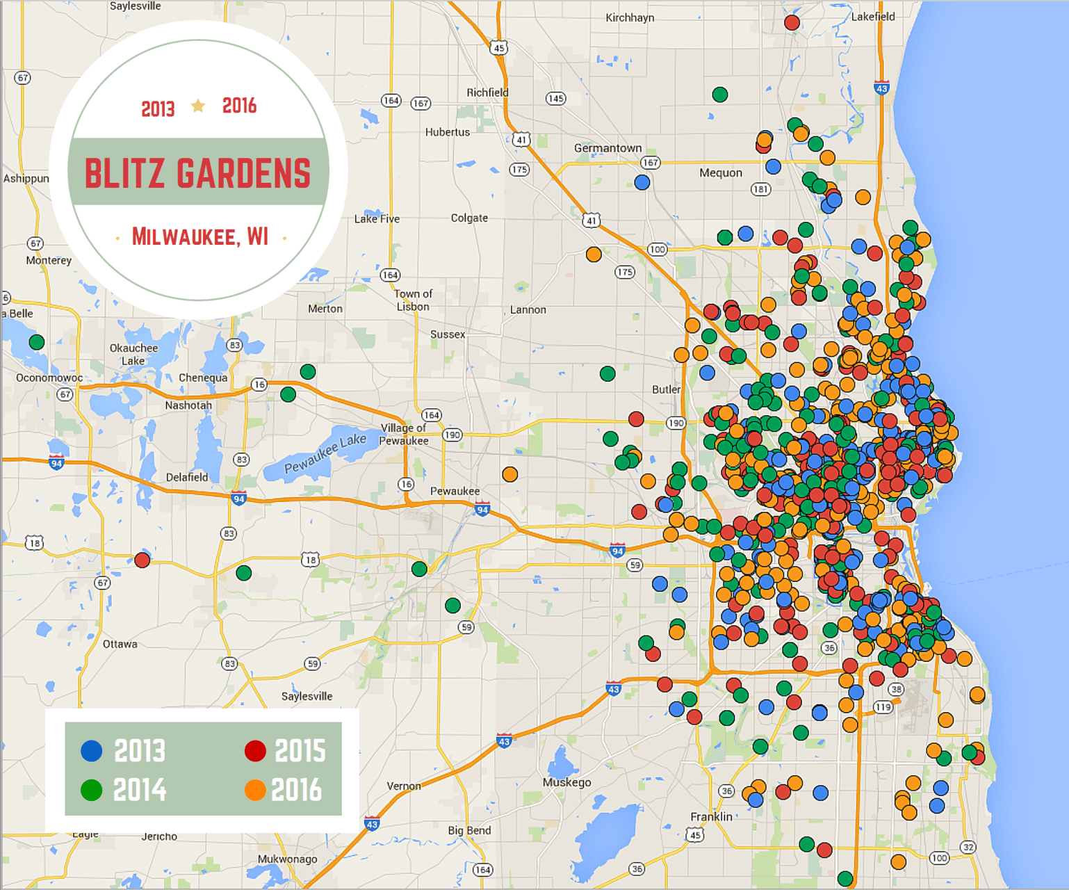 - Map of gardens installed from 2013 to 2016 as part of the Victory’s Garden Initiative’s annual Memorial Day Weekend Blitz.