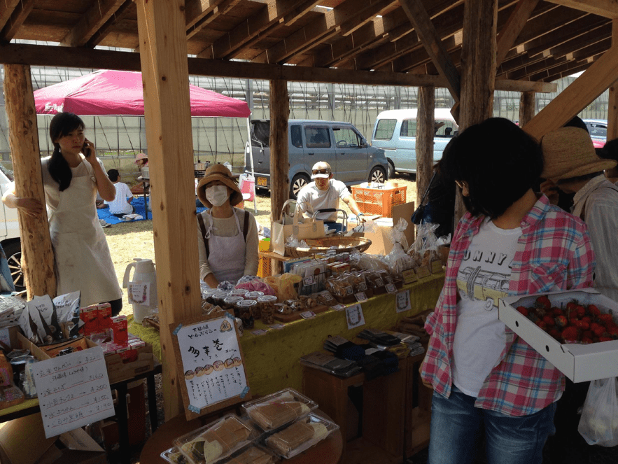 Minami-Aso Farmer’s Market is held three times a year. At the market, small-scale farmers directly sell their own organic vegetables and products, shops sell products which have been made from such harvests and serve meals, and people can enjoy the music. We hope that these local and organic harvests will spread in this region and local people will be able to normally sell and buy such harvests.