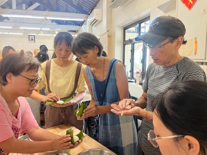Visit to Life Academy (Buddhist learning and exchange center). They also use local currency, and participants cook meals, offer laughter yoga, and provide various events. The photo shows a scene from meal preparation where they were making rice cakes.