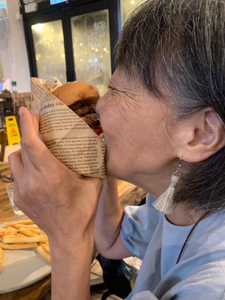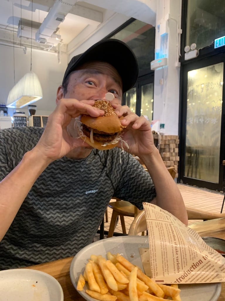 We were also just having Fun! A Big Bite of a vegetarian hamburger!