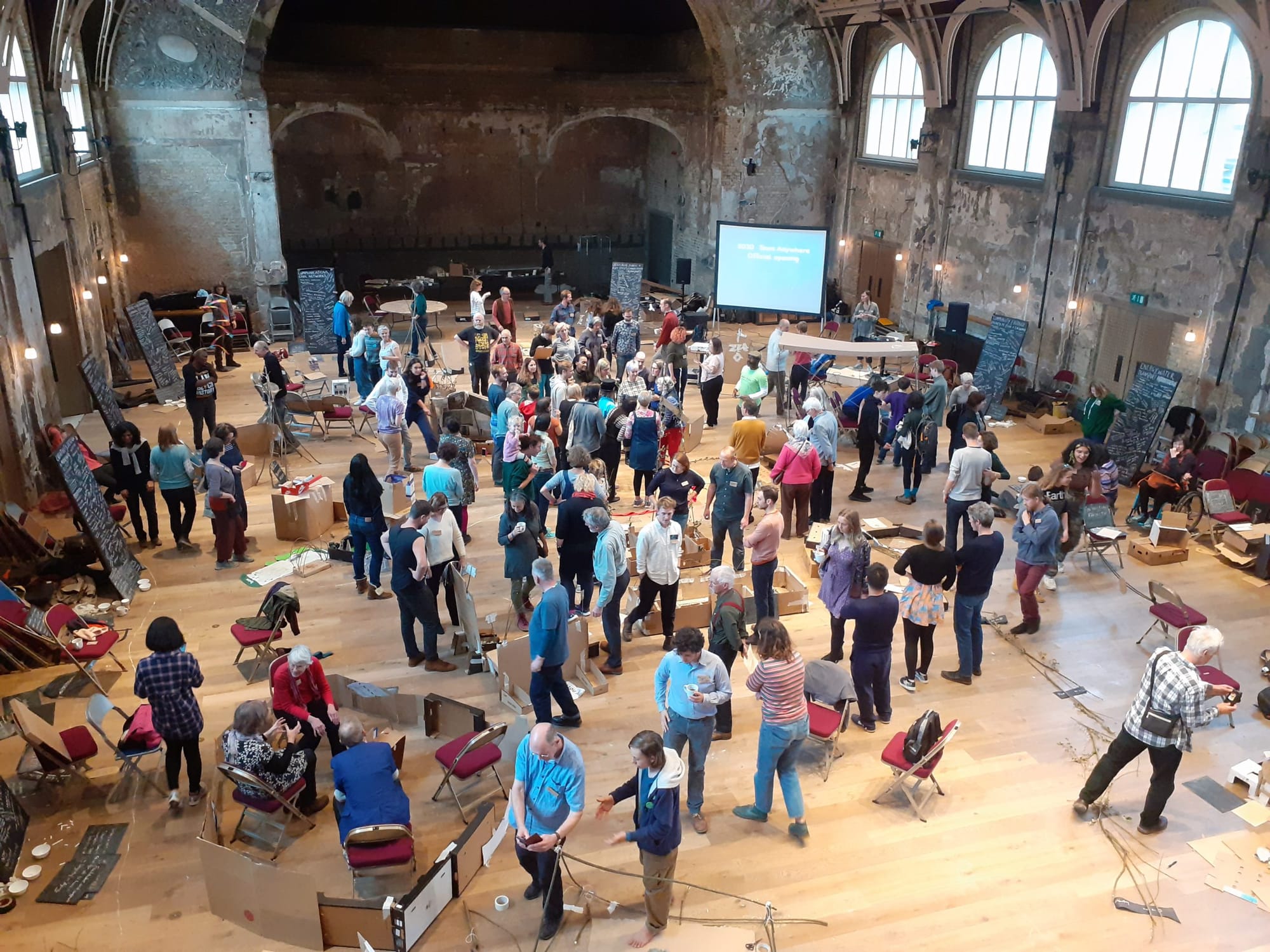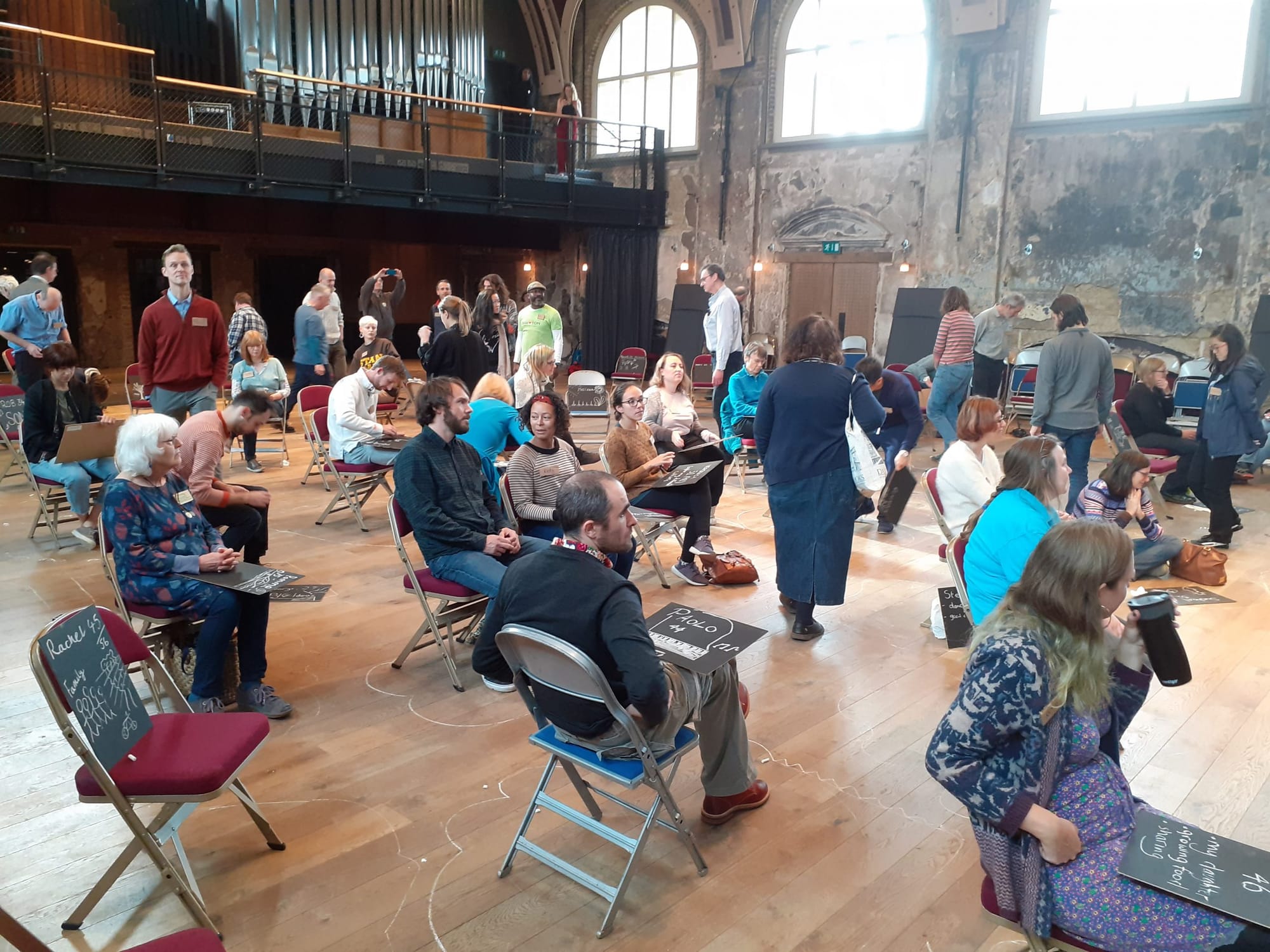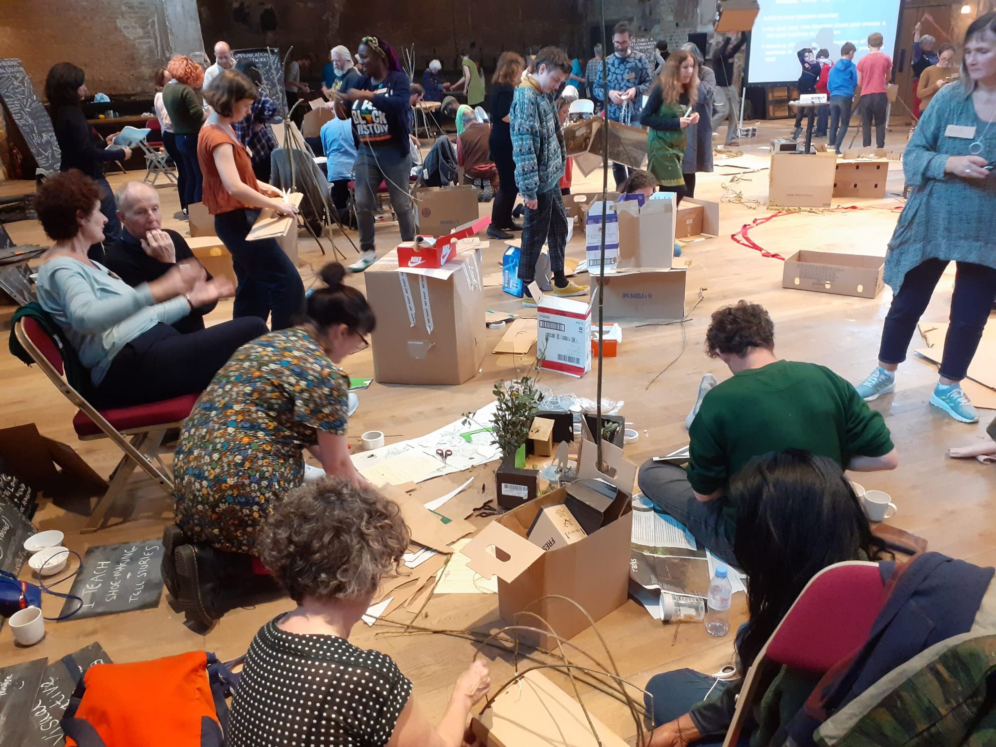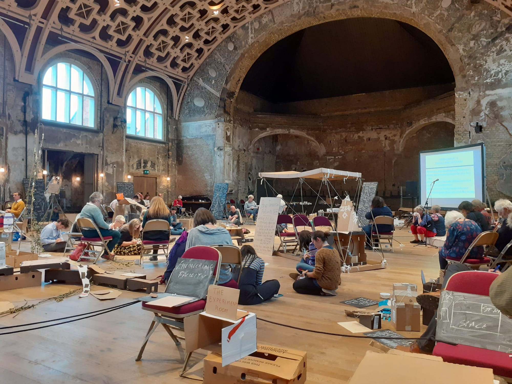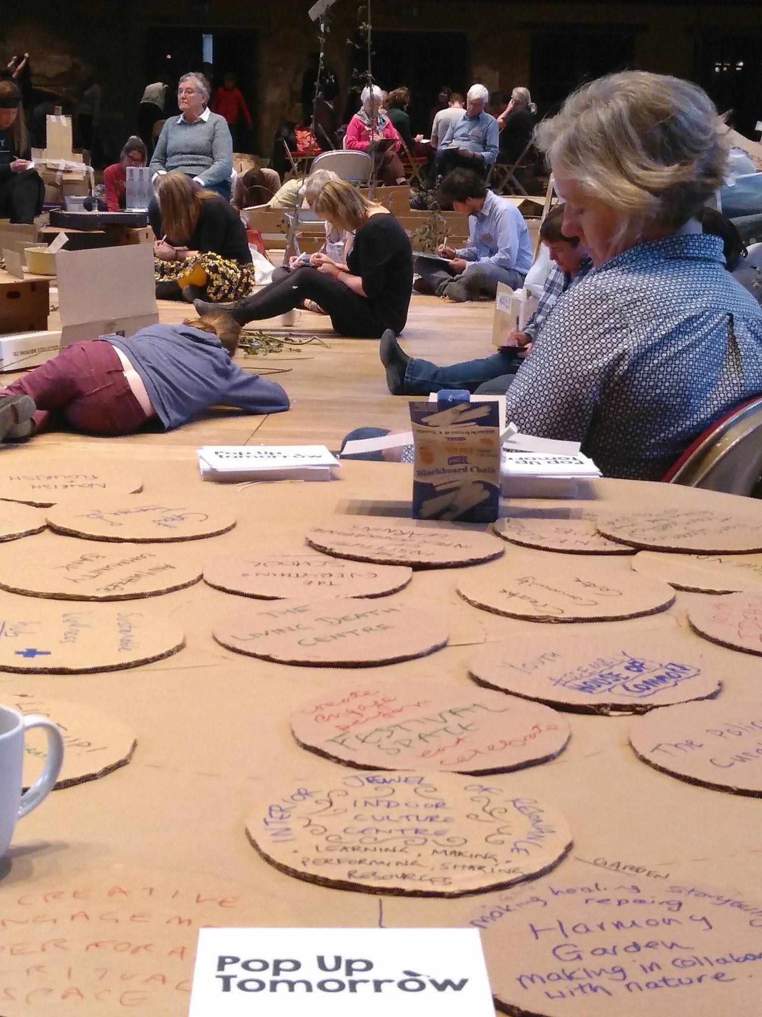 As part of this we collaborated with Encounters Arts and members of the Transition Hub – London & SE to create an event in London. On October 20th 2019 we hosted ‘Pop Up Tomorrow’ at Battersea Arts Centre – a day-long interactive, immersive event focused around ‘Transition Town Anywhere’, a process that had first been done in the same room back in 2012.