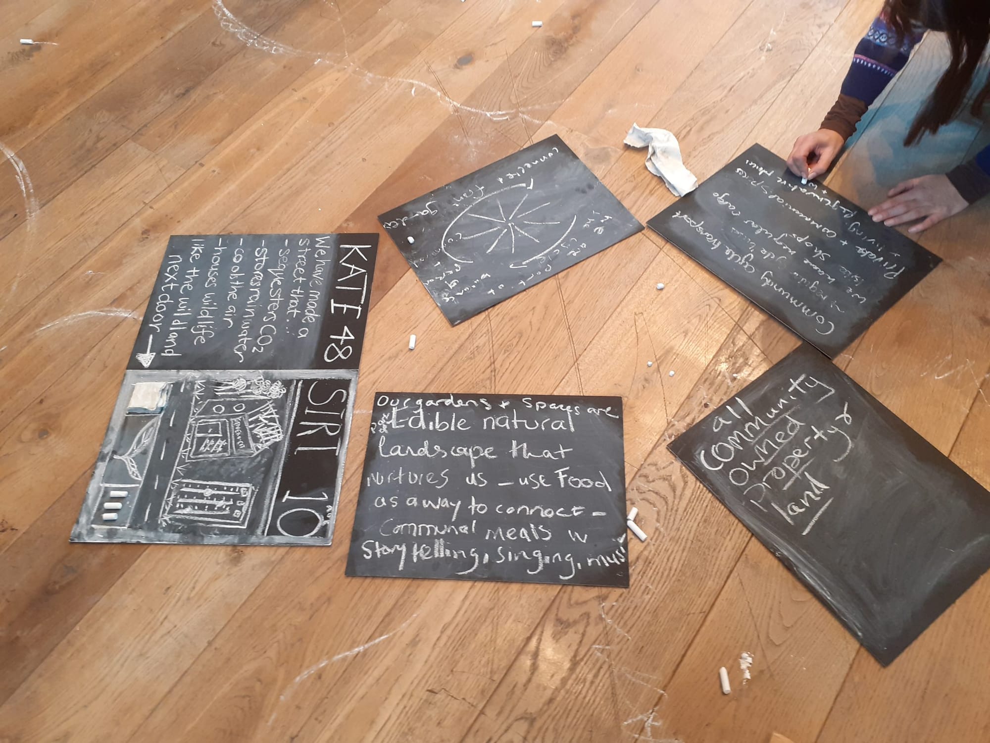 “We began by marking out our individual ‘home’ space, then contemplating on ‘something in your life that sustains you and brings you joy’, followed by working in pairs to exchange stories around one of several suggested themes with our nearest neighbour, then walking around to read other people’s stories on the personal 2030 tablets (chalkboards) we had been supplied with and, finally, exploring how we could work together in our neighbourhood groups to create a zero carbon street community that supports us and allows us to flourish”. Nick Anim.