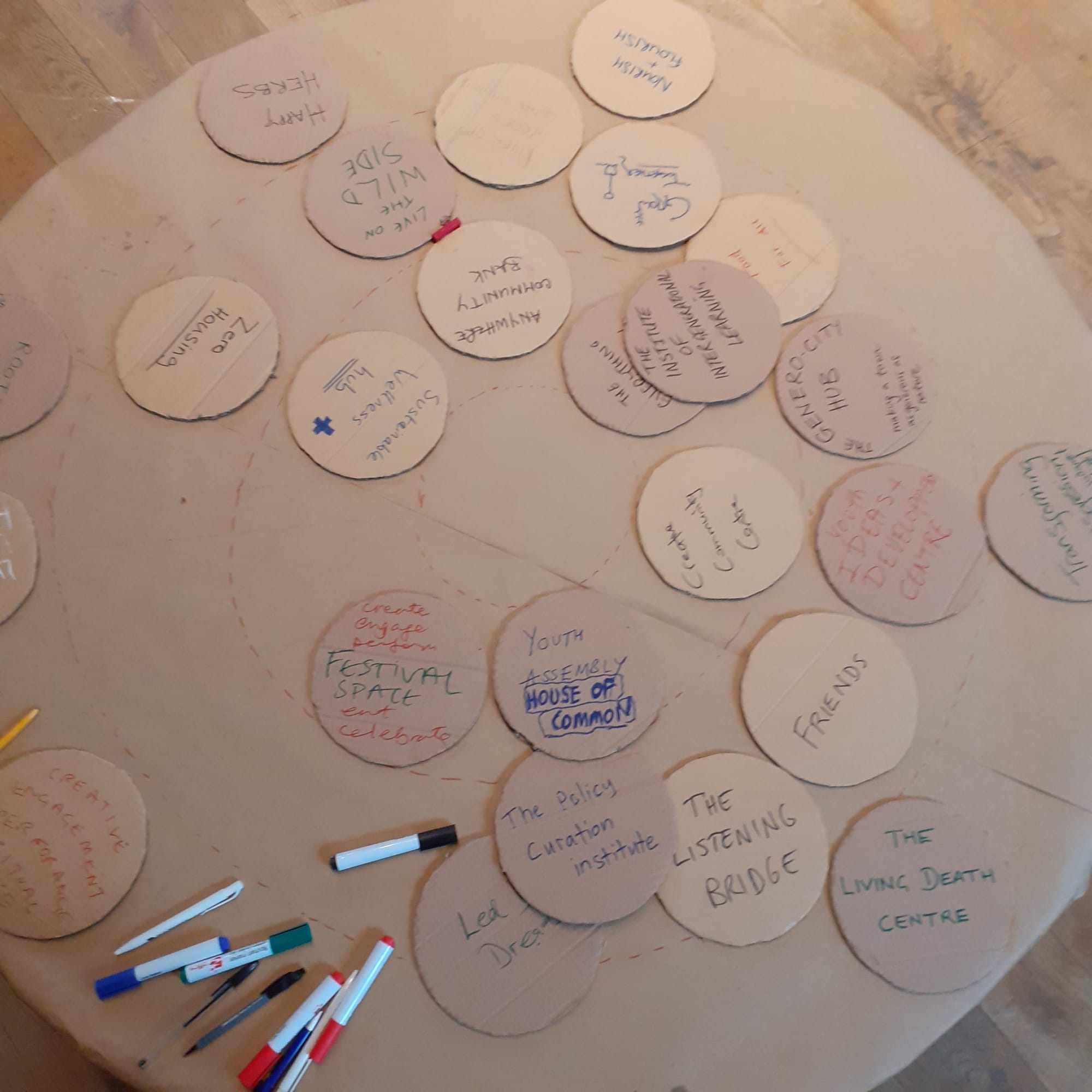 “When I got the opportunity to explore the rest of the town, I was delighted by what I found. Great ideas – some of which I might also have imagined and some which felt completely surprising. I loved the listening post (a place for personal support), the radical reimagining of a school, the place where young people could socialise and input into the democratic process. As I talked to people in other groups I found that pretty much all of their projects had some potential to connect with the one I had been working on”. Sarah McAdam.
