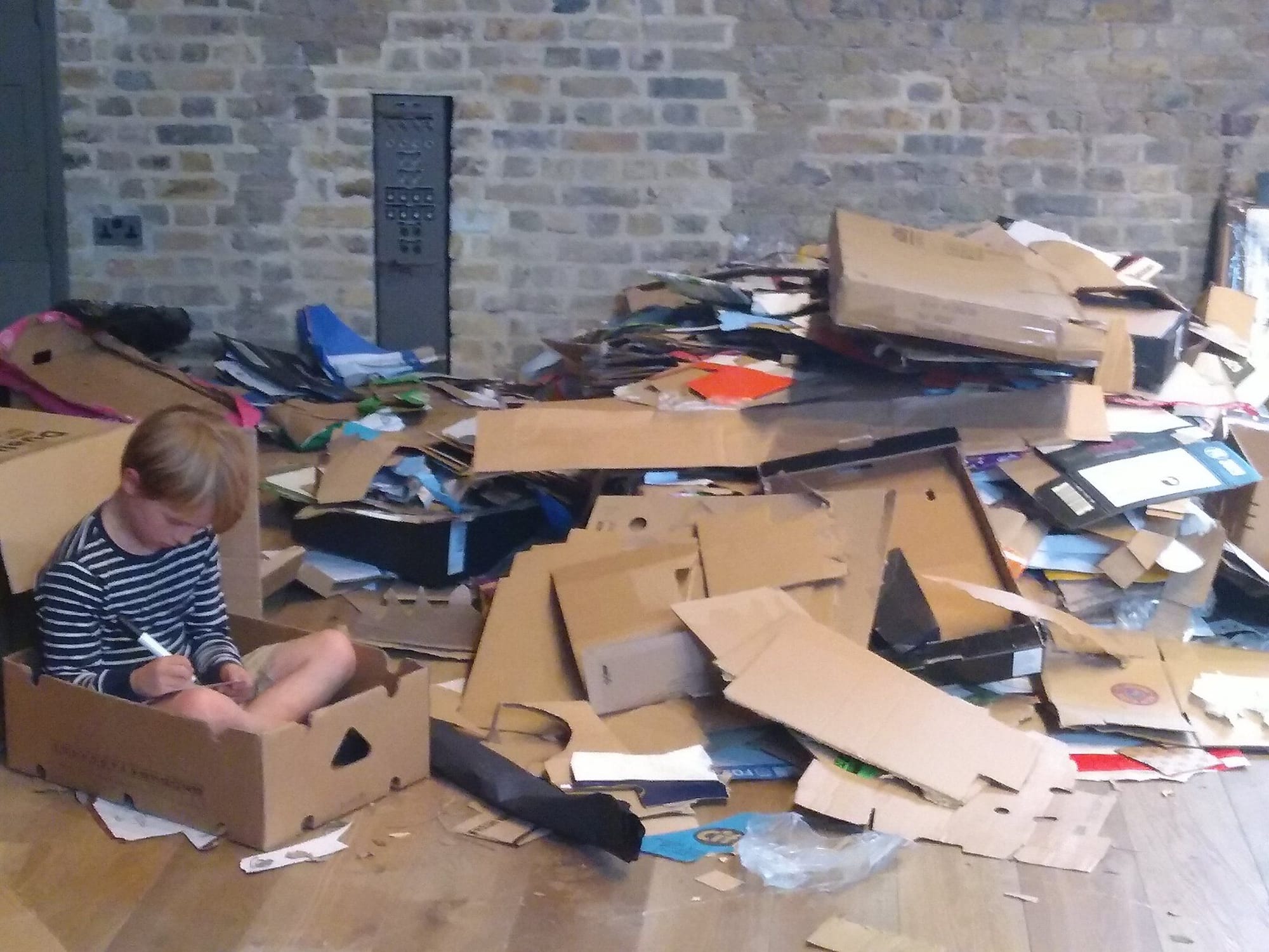 “Two things I noticed at the end, there was a feeling of sadness having to come back to the present from that imagined future. I also loved the feeling of quiet intensity when people wrote their messages to themselves at the end. I took a couple of pics, one of a small boy sitting in a box in a pile of cardboard, totally intent on his letter. It was a real moment of stillness in hubbub of the day (see below)”. Hilary Jennings.